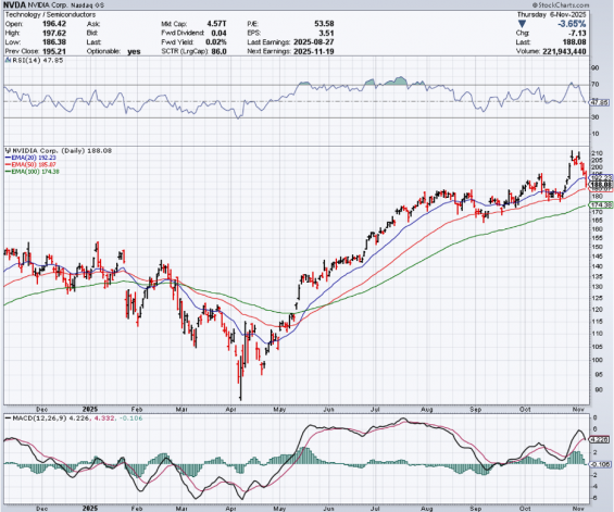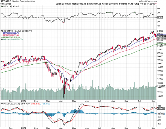 ナスダック指数は11月6日に1.9%急落し、20日移動平均線を割り込んだ。RSI指標は中立ながら弱気寄りで、MACDも下落トレンドを示す。ただし全体としては依然として上昇トレンド内にあり。もし23,000ポイントの節目でサポートを得られれば、しばらく上昇を維持できる見込み。しかし、下落が続き22,600付近で50日移動平均線を割り込むと、さらなる大幅下落につながる可能性がある。米中間で良好な合意が成立したとはいえ、地政学的リスクが依然として存在し、大幅な調整を招く恐れあり。したがって、ハイテク株については押し目買い・分割建てでの買いを推奨し、軽めのポジションを維持するのが望ましいだろう。