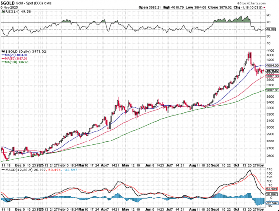 金相場は10月下旬以降下落し、20日移動平均線を下回った。現在は1オンスあたり3,950〜4,030ドルのレンジで推移。RSIは中立、MACDはデッドクロス状態にあり、短期的にはもみ合いから下方向への動きが続く可能性。3,950ドルを割り込むと、さらに3,900ドル付近まで下落するリスクあり。
